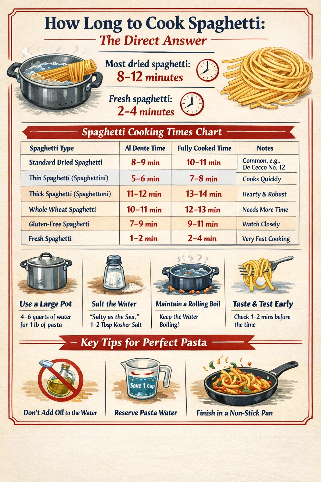 সবচেয়ে বেশি শুকনো স্প্যাগেটি লাগে 8 থেকে 12 মিনিট ফুটন্ত লবণাক্ত জলে রান্না করতে, বেধ এবং আপনার পছন্দের টেক্সচারের উপর নির্ভর করে। আল ডেন্তে - ইতালীয় রান্নার সোনার মান - প্যাকেজ পরিসরের নিম্ন প্রান্তের জন্য লক্ষ্য রাখুন, সাধারণত প্রায় 8 থেকে 9 মিনিট। টাটকা স্প্যাগেটি অনেক দ্রুত রান্না করে, সাধারণত শুধু মাত্র 2 থেকে 4 মিনিট . পুরো গমের স্প্যাগেটি প্রায়শই আঠালো না হয়ে সঠিকভাবে নরম হতে 10 থেকে 12 মিনিটের প্রয়োজন হয়।