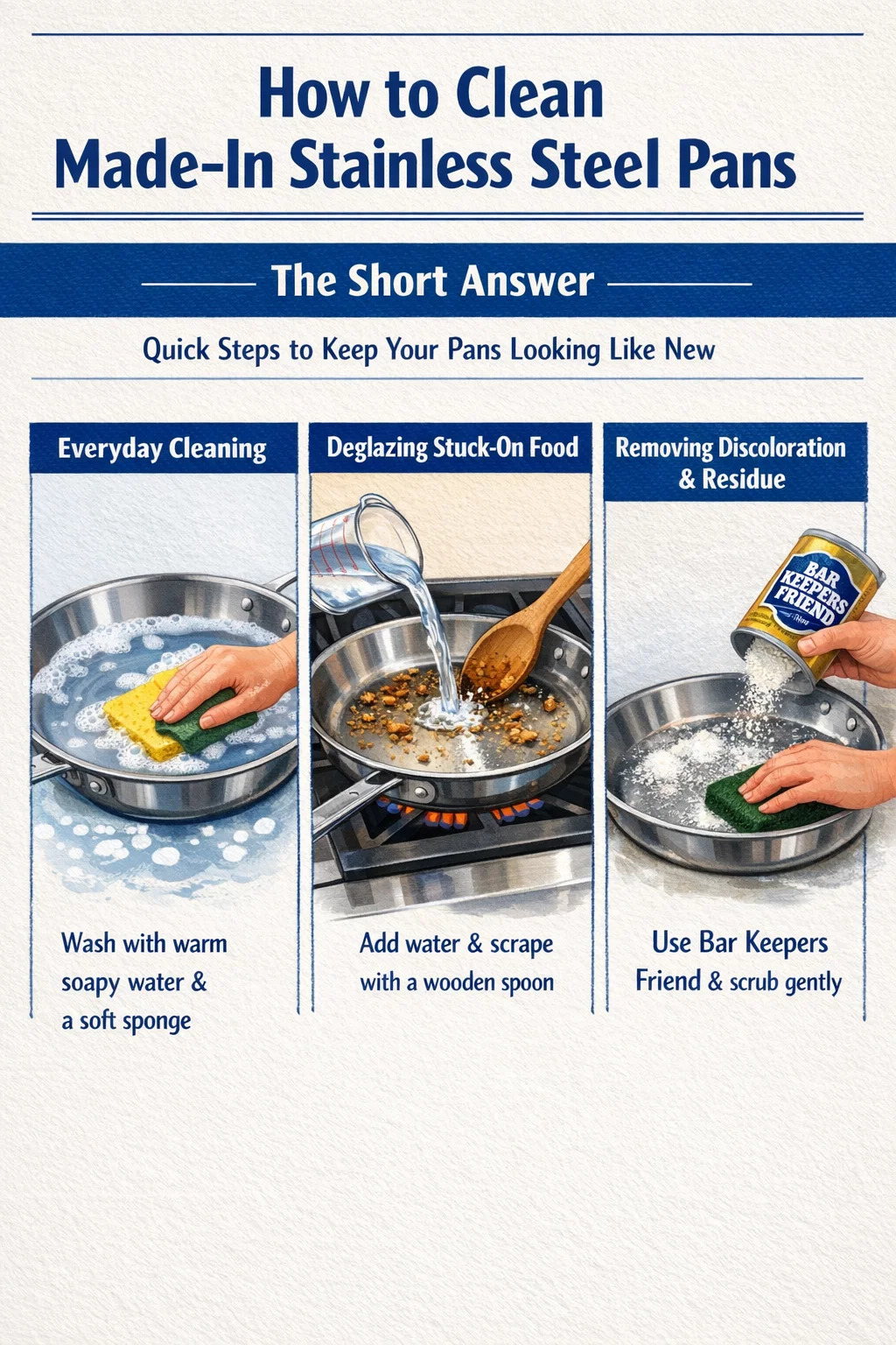 প্রতিদিন পরিষ্কার করার জন্য, আপনার তৈরি স্টেইনলেস স্টিলের প্যানটি ঠান্ডা হওয়ার সাথে সাথে উষ্ণ সাবান জল এবং একটি নরম স্পঞ্জ দিয়ে ধুয়ে ফেলুন . আটকে থাকা খাবারের জন্য, পানি যোগ করে এবং কাঠের চামচ দিয়ে স্ক্র্যাপ করে গরম থাকা অবস্থায় প্যানটিকে ডিগ্লাজ করুন। বিবর্ণতা বা একগুঁয়ে অবশিষ্টাংশের জন্য, বার কিপার ফ্রেন্ড এবং জলের পেস্ট ব্যবহার করুন, আলতো করে ঘষুন এবং ভালভাবে ধুয়ে ফেলুন। এই প্যানগুলির সাথে আপনি যা মুখোমুখি হবেন তার 95% এটি কভার করে।