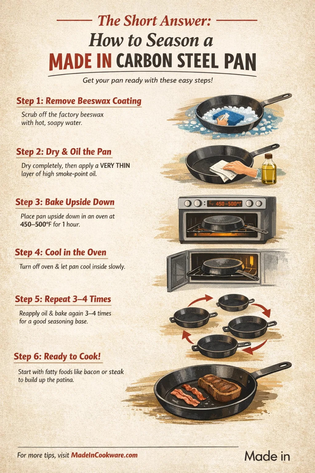একটি মেড ইন কার্বন স্টিল প্যানের সিজন করার জন্য, আপনি এটি দিয়ে জাহাজে থাকা প্রতিরক্ষামূলক মোমের আবরণটি ধুয়ে ফেলুন, এটি সম্পূর্ণ শুকিয়ে নিন, পুরো পৃষ্ঠে উচ্চ ধোঁয়া-বিন্দু তেলের একটি খুব পাতলা স্তর প্রয়োগ করুন এবং তেলটি একটি শক্ত, চটকদার স্তরে পলিমারাইজ না হওয়া পর্যন্ত এটিকে 450-500° ফারেনহাইট তাপমাত্রায় একটি চুলায় গরম করুন। সেই প্রক্রিয়াটি পুনরাবৃত্তি করুন 3 থেকে 4 বার আপনার প্রথম রান্নার আগে। এটাই এর মূল কথা। অন্য সব কিছু — নির্দিষ্ট তেল, চুলার তাপমাত্রার সূক্ষ্মতা, স্টোভটপ পদ্ধতি, দীর্ঘমেয়াদী যত্ন — এই মৌলিক কাঠামোর উপরে শুধু পরিমার্জন।