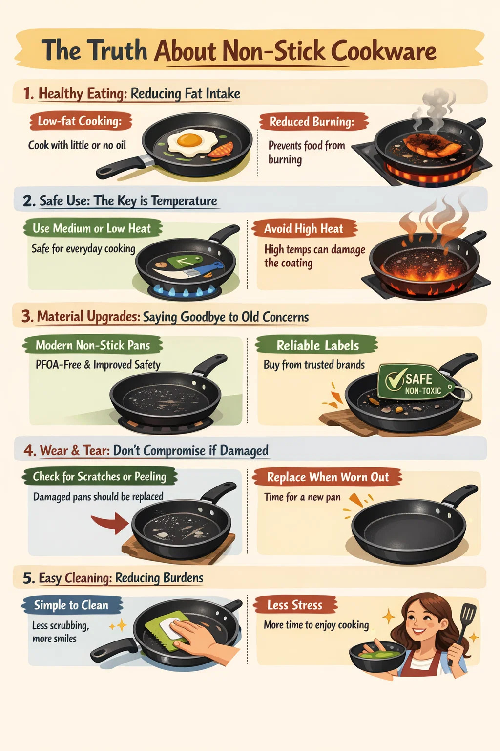 পুরানো এবং নতুন মডেলের মধ্যে পার্থক্য: অনেকেরই নন-স্টিক প্যান নিয়ে উদ্বেগ রয়েছে কারণ কিছু পুরানো পণ্য উত্পাদন প্রক্রিয়াতে কিছু কম পরিবেশ বান্ধব সংযোজন ব্যবহার করে। যাইহোক, আধুনিক নন-স্টিক কুকওয়্যার প্রযুক্তিগতভাবে আপগ্রেড করা হয়েছে, এবং নামী ব্র্যান্ডগুলি এই বিতর্কিত উপাদানগুলি এড়িয়ে চলে।