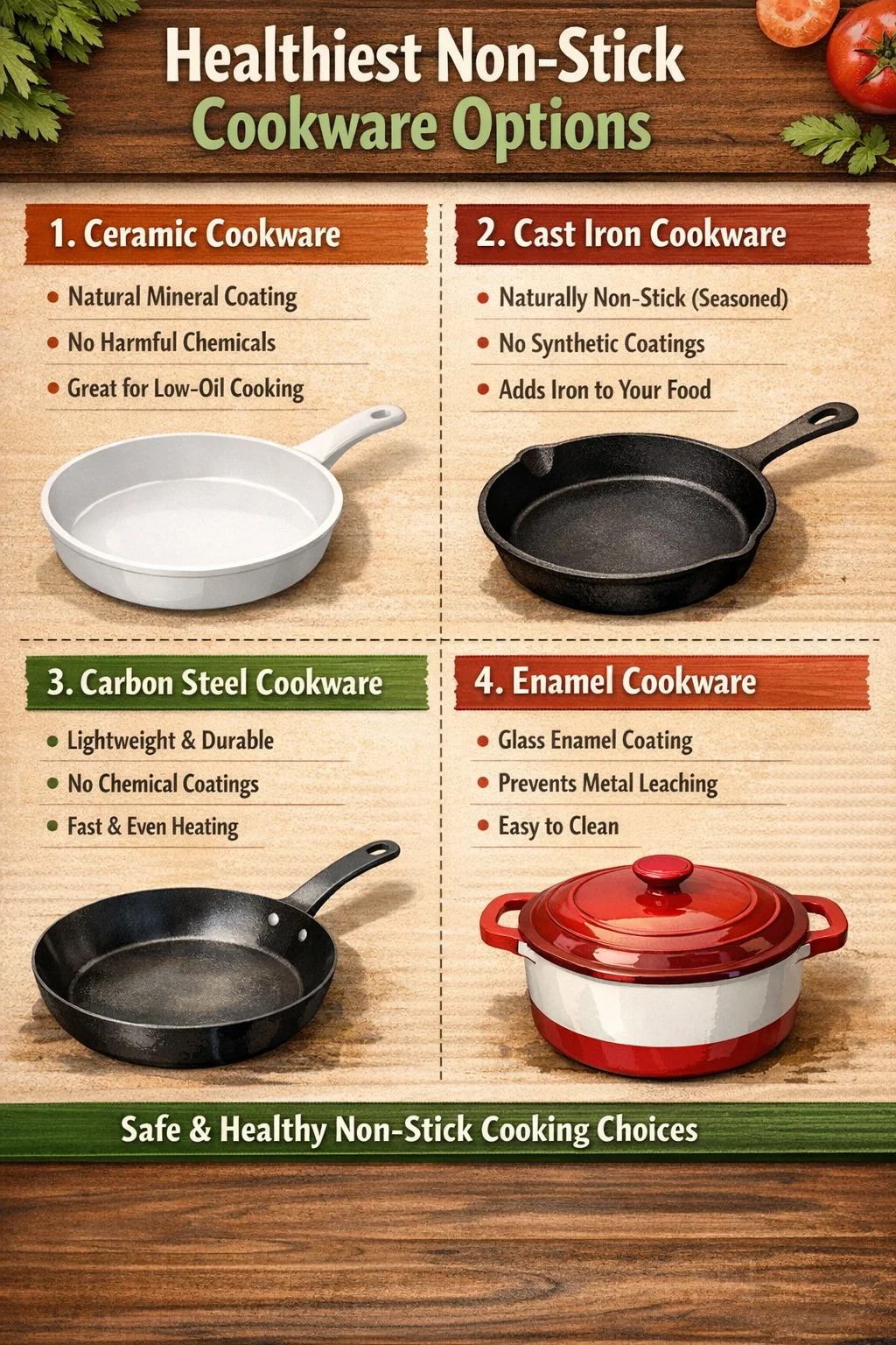 নীচে বিভিন্ন ধরণের নন-স্টিক কুকওয়্যারগুলির একটি বিশদ ভূমিকা রয়েছে যা ব্যাপকভাবে স্বাস্থ্যকর হিসাবে বিবেচিত হয়: