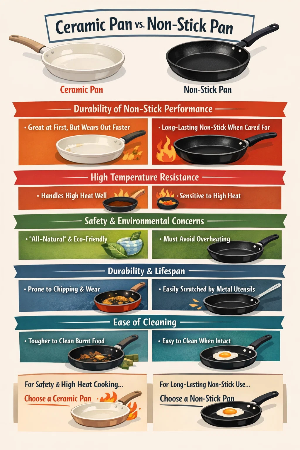 Cookware, সিরামিক cookwares এবং ঐতিহ্যগত নির্বাচন করার সময় নন-স্টিক রান্নার জিনিসপত্র প্রায়ই তুলনা করা হয়। উভয়েরই তাদের সুবিধা এবং অসুবিধা রয়েছে এবং কোন একক "ভাল" বিকল্প নেই; এটা আপনি কি অগ্রাধিকার উপর নির্ভর করে.