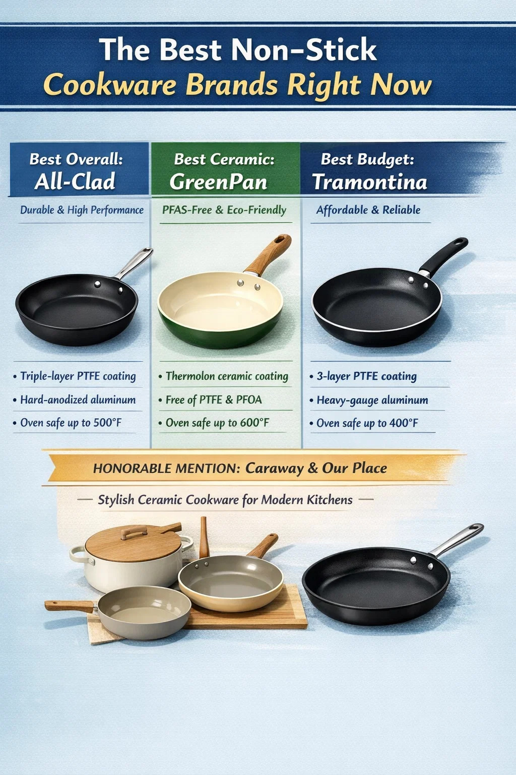 আপনি যদি একটি সোজা উত্তর চান: অল-ক্ল্যাড, জিউইলিং, এবং গ্রীনপ্যান ধারাবাহিকভাবে শীর্ষ নন-স্টিক কুকওয়্যার ব্র্যান্ড হিসাবে স্থান পেয়েছে পেশাদার পর্যালোচনা, হোম কুক সম্প্রদায়, এবং স্বাধীন ল্যাব পরীক্ষা জুড়ে। স্থায়িত্ব এবং কর্মক্ষমতার জন্য অল-ক্ল্যাড লিডস, Zwilling (এর Demeyere লাইন সহ) গুরুতর বাবুর্চিদের জন্য উৎকৃষ্ট, এবং যারা PTFE-ভিত্তিক আবরণ এড়িয়ে চলে তাদের জন্য গ্রীনপ্যান সিরামিক নন-স্টিক সেগমেন্টের শীর্ষে রয়েছে।