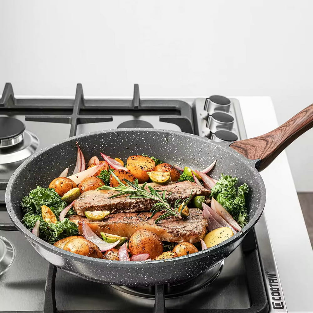 কাঠের হাতল সহ কুকওয়্যার মাল্টিপারপাস কাস্টমাইজড ননস্টিক গভীর ফ্রাইং প্যান